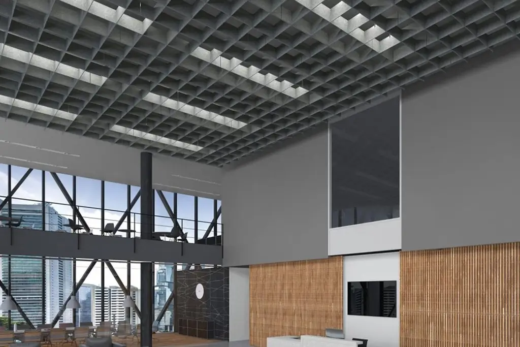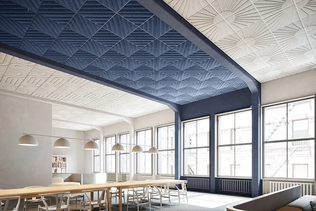 Dimensional suspended 24-in x 24-in tegular panels offered in 5 modern designs that can create many unique looks based on layout.