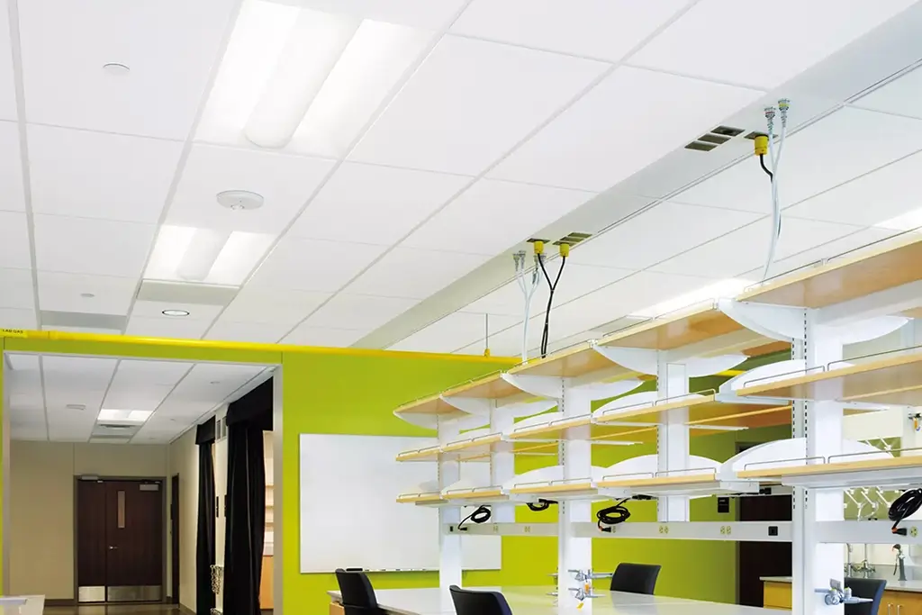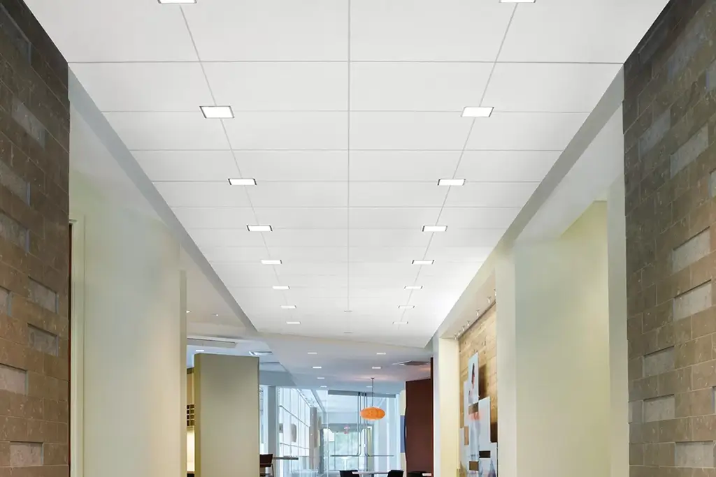Sophisticated slotted 9/16-in suspension system with a narrow 1/4-in reveal.